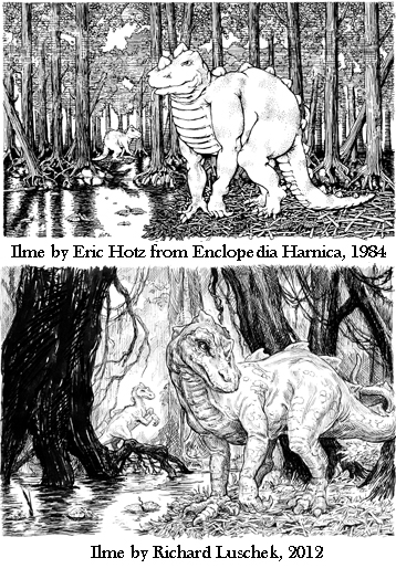 When I started with Harn one of the things that stood out for me was the look of the product. Of course there were the great maps, but the art of Eric Hotz was what really attracted my attention. It had a simple and gritty realism. When I started illustrating for Harn in 2001 I did my best to continue that trend. I learned a lot trying to emulate the standard set by Hotz. I think I have since developed my own style, but it has definitely been influence by the work of Hotz. So, for the page one art for Ilme I thought I would pay homage to the original Hotz image- 28 years later. In preparation of this article I had been studying and drawing dinosaurs in an attempt to create a more realistic beast by improving on the anatomy and setting.